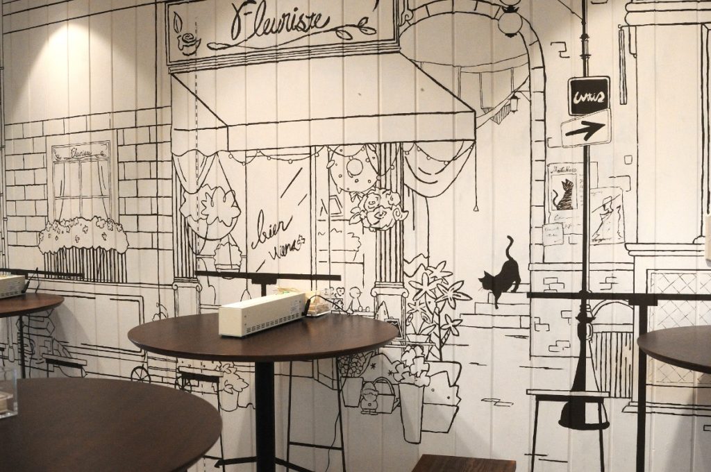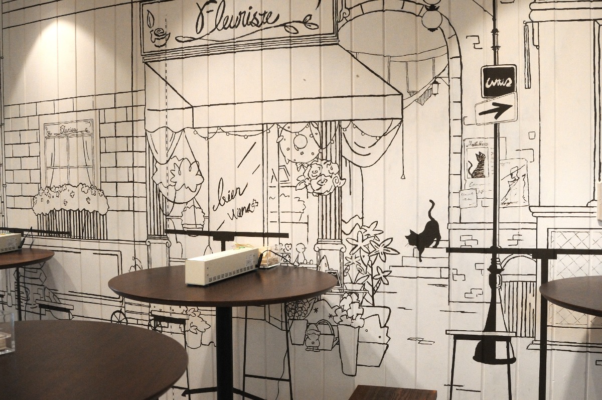 店内の壁は、奈良教育大学の美術専攻学生がパリをイメージして描いているそう。