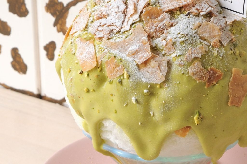 『onna wa utsuwa』のかき氷は、濃厚ソースがポイントのひとつ。 奈良市の『日乃出製氷』さんの氷を使ったふわふわかき氷に、黄緑色のピスタチオソースがたっぷり。 このかき氷の中には、ピスタチオソースや古都華がごろごろ。 全体にやさしい甘さのミルクシロップがかかっているので、最後まで飽きることなく食べられる。