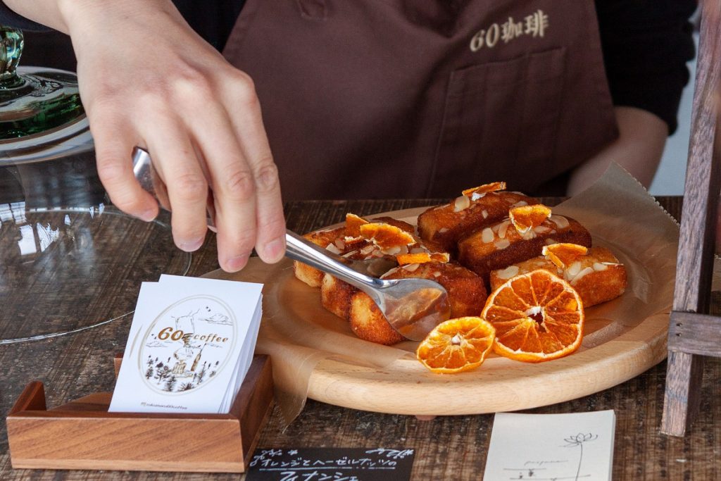 どの珈琲にするか、菓子とのペアリングで選ぶのも◎。この日並んでいたのはオレンジとヘーゼルナッツのフィナンシェ。