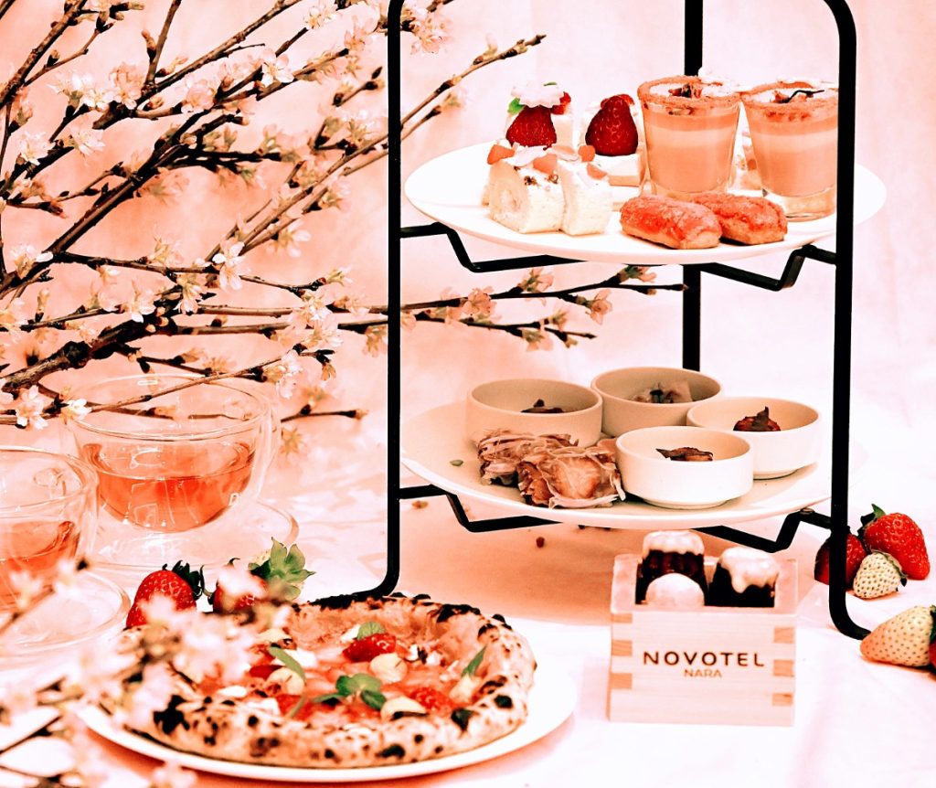 春の奈良を彩る佐保川の桜並⽊沿いに位置する『ノボテル奈良』で「古都華」を主役に、桜がふわりと香る春のアフタヌーンティを開催中。
