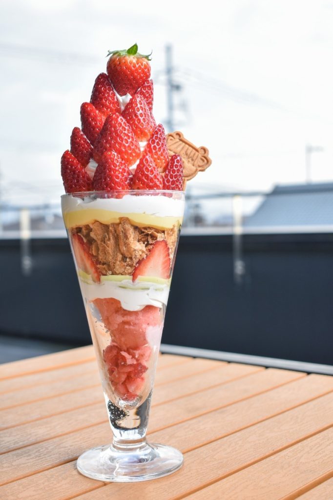 毎年いちごシーズンになると、この「古都華」を贅沢に使ったパフェを目当てに県内外から多くの人が訪れる。