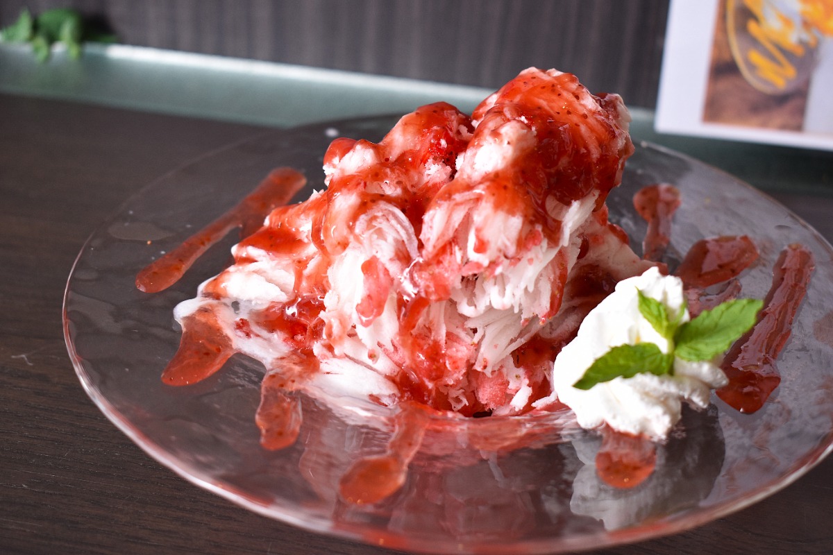 ふわトロな氷とフローズンイチゴのシャリシャリ食感、さらに濃厚な自家製いちごソースの織り成す甘みが、ゴージャスな見た目と相まって、幸せな時間を演出してくれる。
