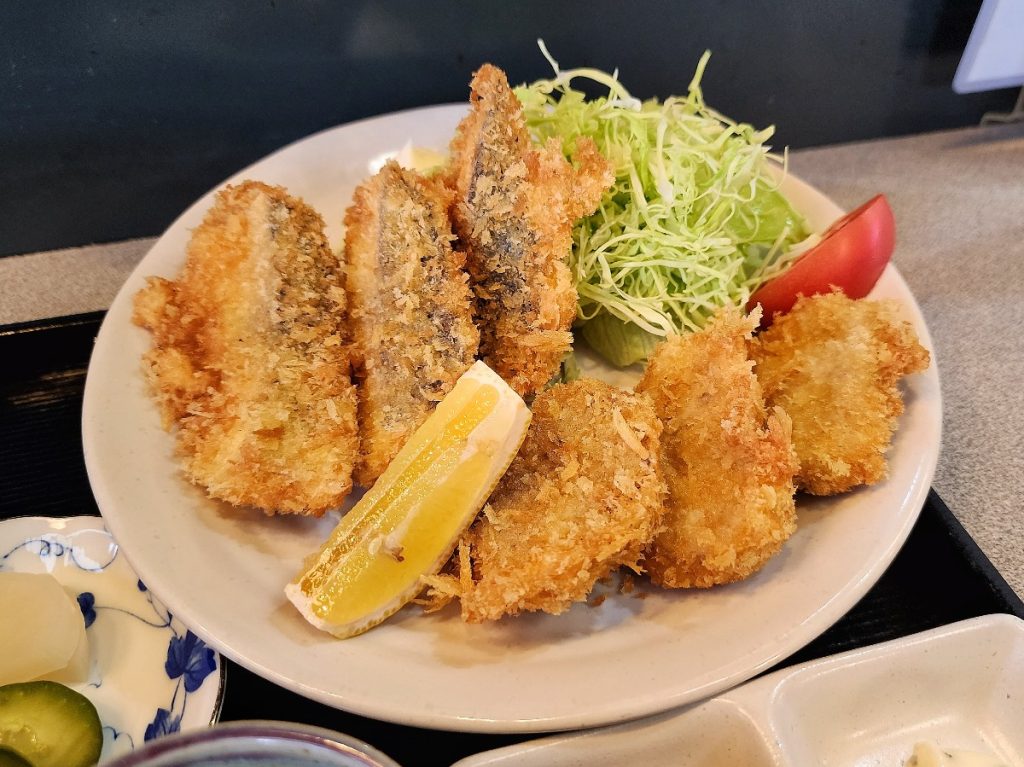 あじフライは身が分厚くふわふわで、自家製のタルタルソースや卓上の塩をつけて楽しみました。