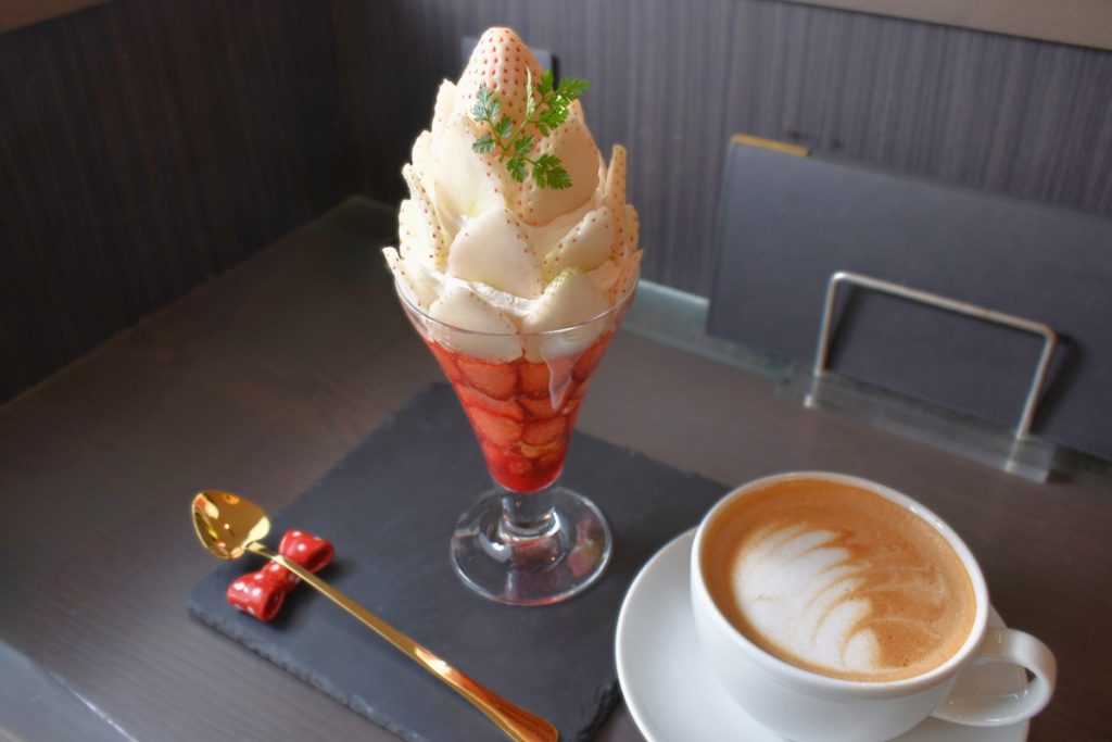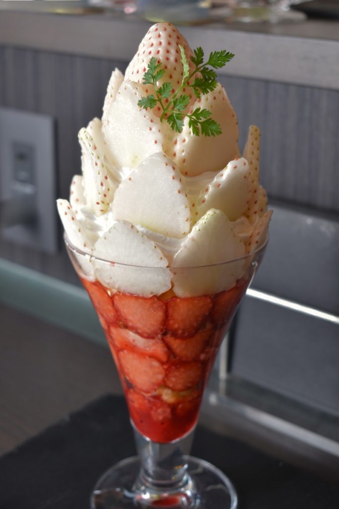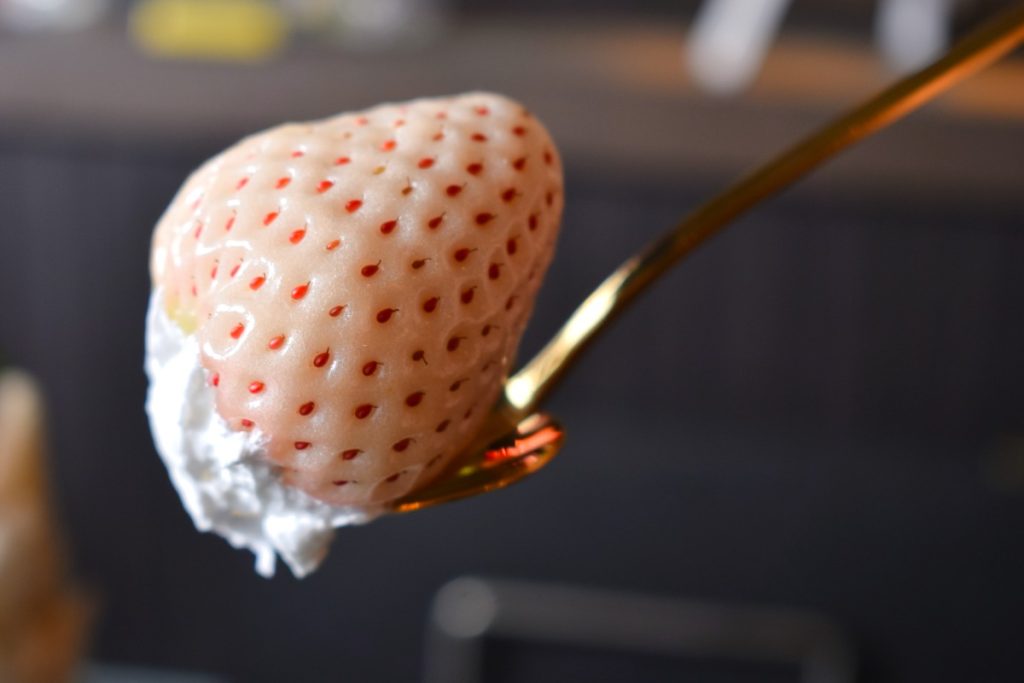 こちらのパフェやかき氷など、地元産の古都華(イチゴ)を使ったスイーツは『ぱーぷる』でも季節ごとに登場してきたが、今回はなんと「天使のイチゴ」とも呼ばれている白苺“エンジェルエイト”を豪華に使ったイチゴパフェをご紹介する。