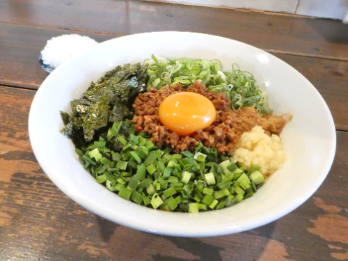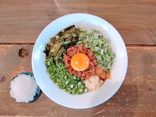 ひき肉を鷹の爪とニンニク、醤油で炒めた台湾ミンチ、ネギ、ニラ、ニンニク、魚粉、卵黄をトッピング。