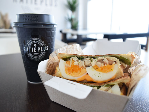 こちらのサンドは、レモン味であっさりのチキンとゆで卵、チェダーチーズとサニーレタスなどを、しっとりとしたパンで挟んだホットサンドの中では一番人気のメニュー。