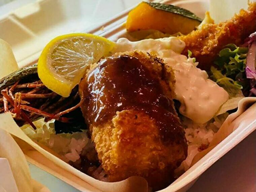 写真のミックスフライ弁当には特大の有頭大海老フライが1匹丸ごとと看板メニューでもあるかにクリームコロッケが入っています!もちろんタルタルソースも自家製。そして自家製のカニクリームコロッケはなんとカレー風味。他では味わえない一品です。