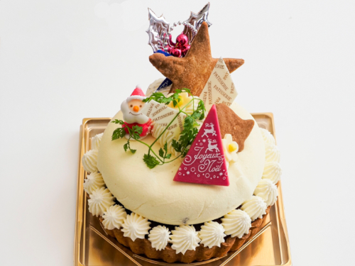 真っ白な雪を彷彿とさせるホワイトチョコの中に、サンタをイメージした赤いいちごムースを入れ、MAMAN自慢のタルト台に乗せてホワイトチョコを全面に吹き付けたクリスマスケーキ。