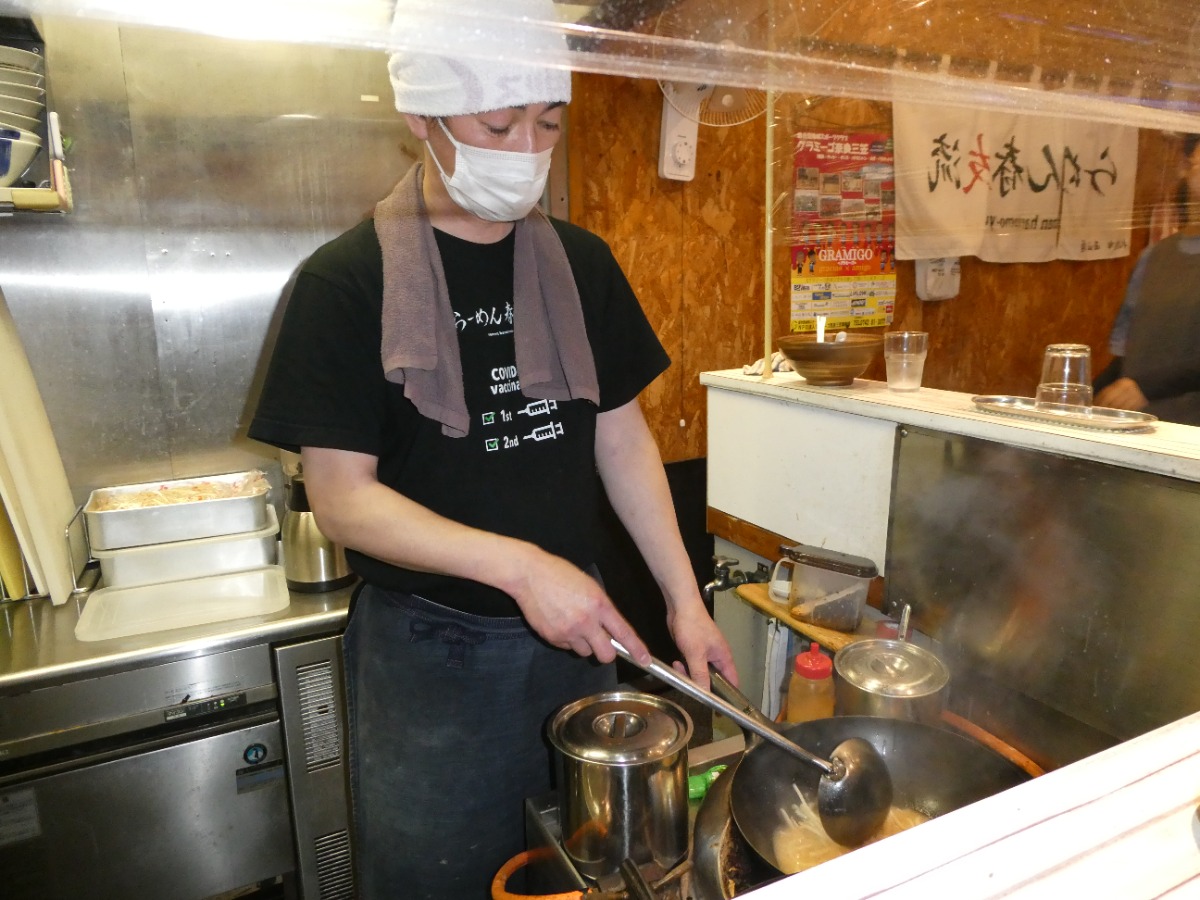 オープンキッチンでその光景を見ていると、その豪快な調理と香りに食欲が刺激され、着丼が待ち遠しいですね。