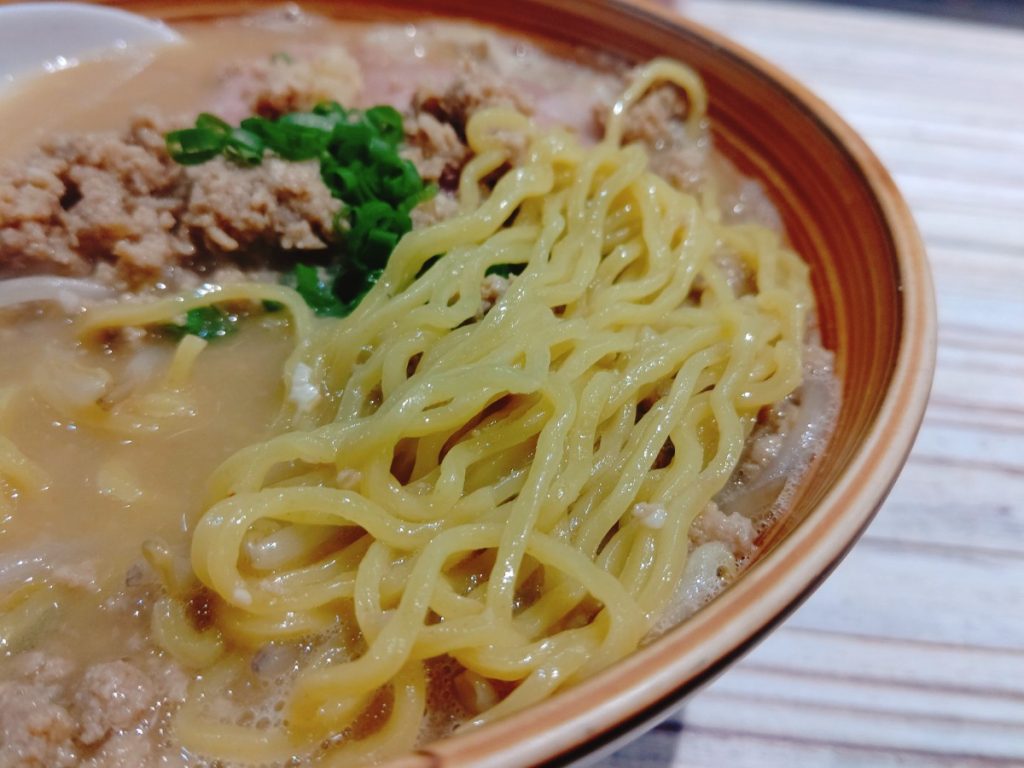北海道の名門・西山製麺からわざわざ取り寄せる中細のちぢれ麺はプリプリの弾力とツルツルののど越しで、食べ応え抜群。