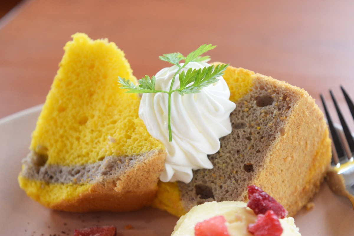 小麦アレルギーの方にもスイーツを楽しんでもらえるようにと、米粉を使用して作られたシフォンケーキはふんわり、もっちりとした食感がクセになる。