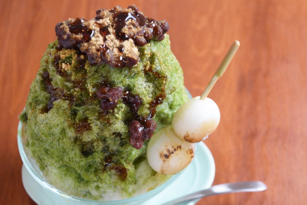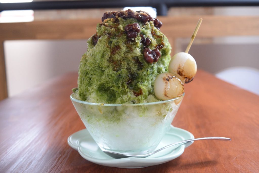 写真の「宇治金時」かき氷は、店内で炊いたあずきに、オリジナルブレンドの抹茶シロップ、さらには自家製醤油だれがかかった団子がおいしさの秘訣。