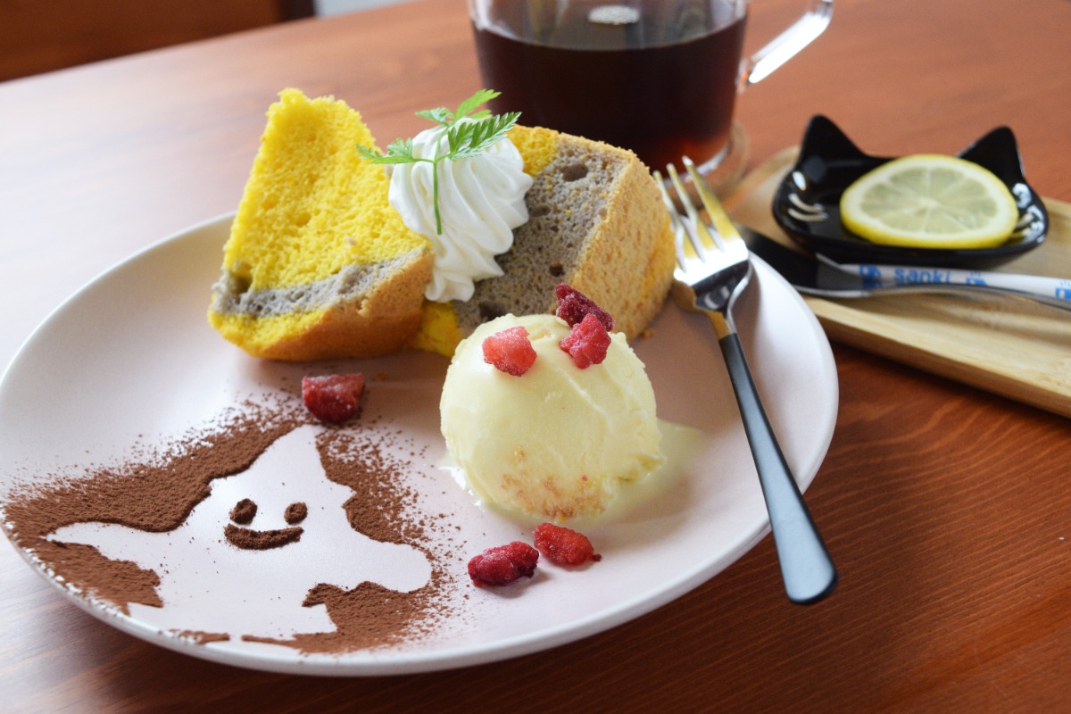 店内では、お好きなシフォンケーキに生クリームとアイスクリームを添えた贅沢なプレートがいただける。