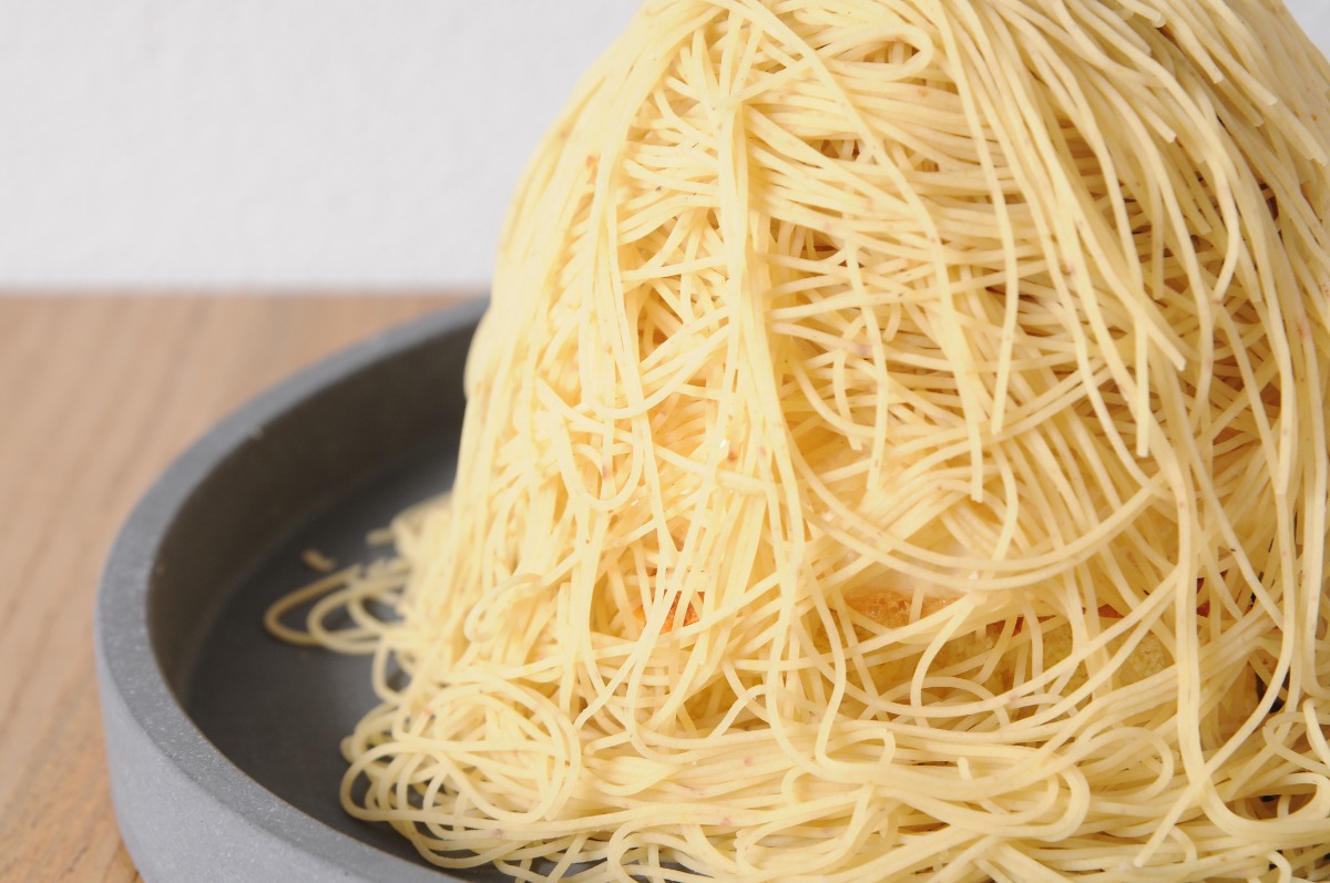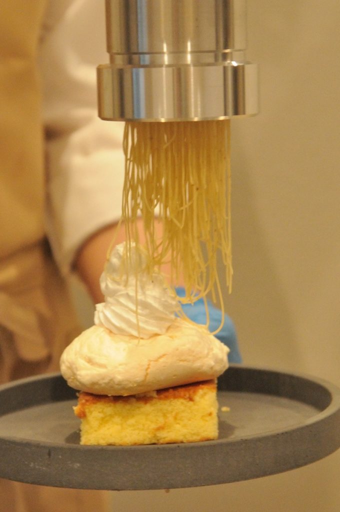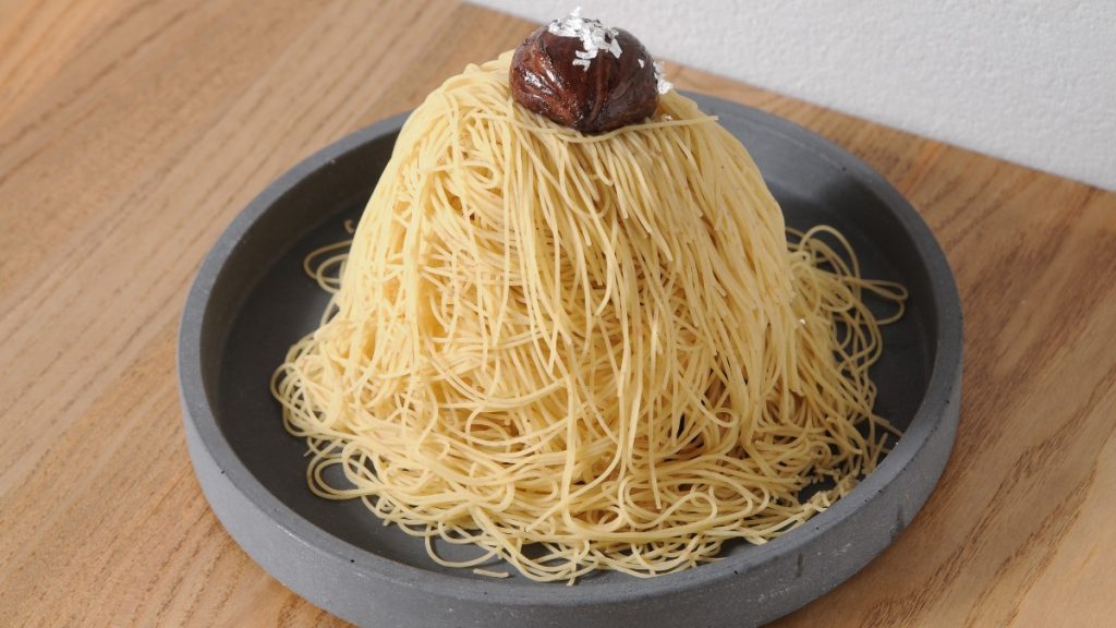 スポンジの上に、モンブランクリームがたっぷりと被せられていくその様子に感動!