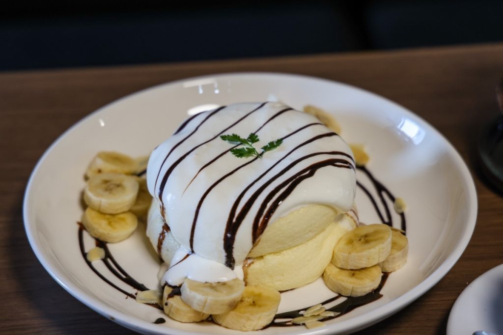みんな大好きバナナを添えたスフレパンケーキ。