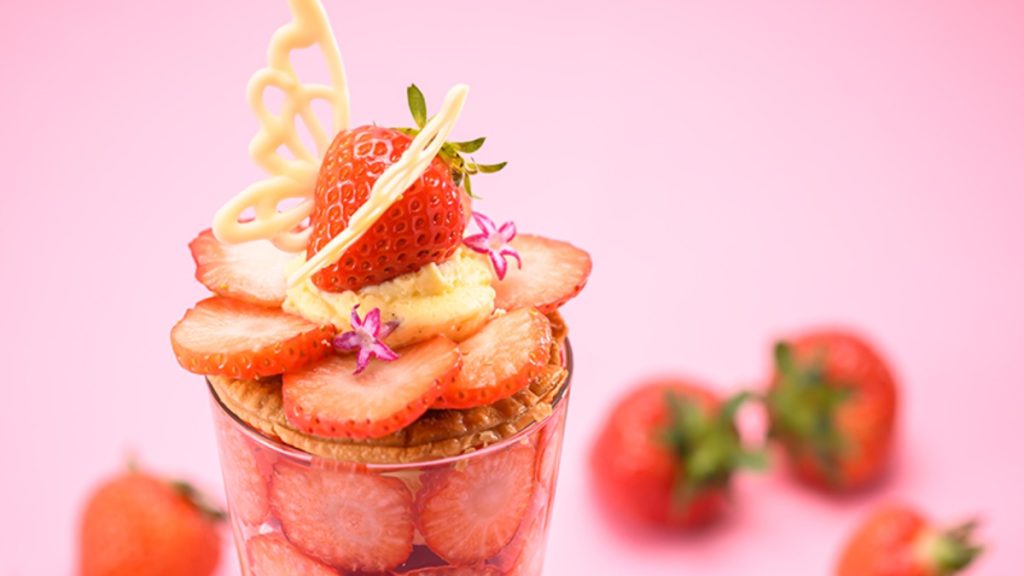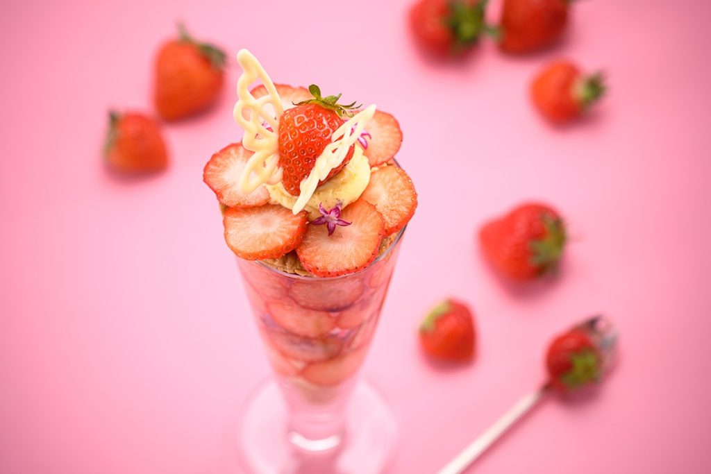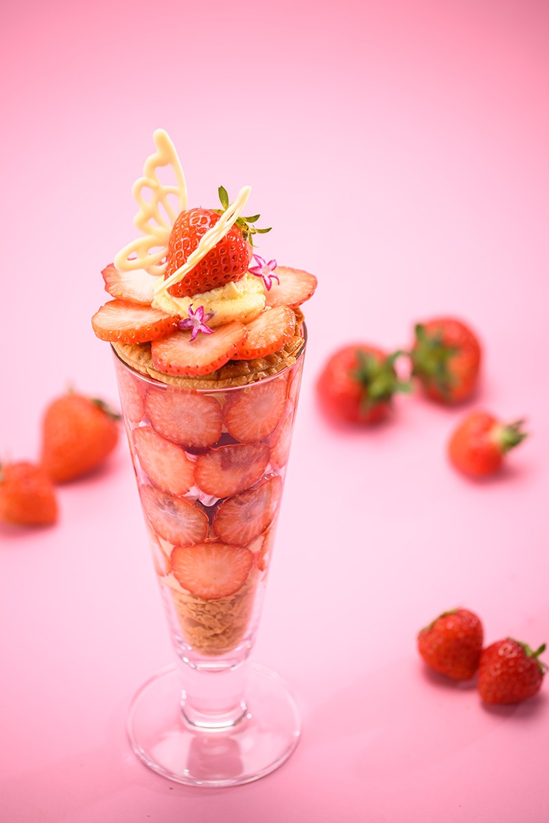 旬のいちごをメインに、ピスタチオアイスミルクとあまおうアイスミルク、ハイビスカスのジュレとカスタードクリームを加えたパフェ。