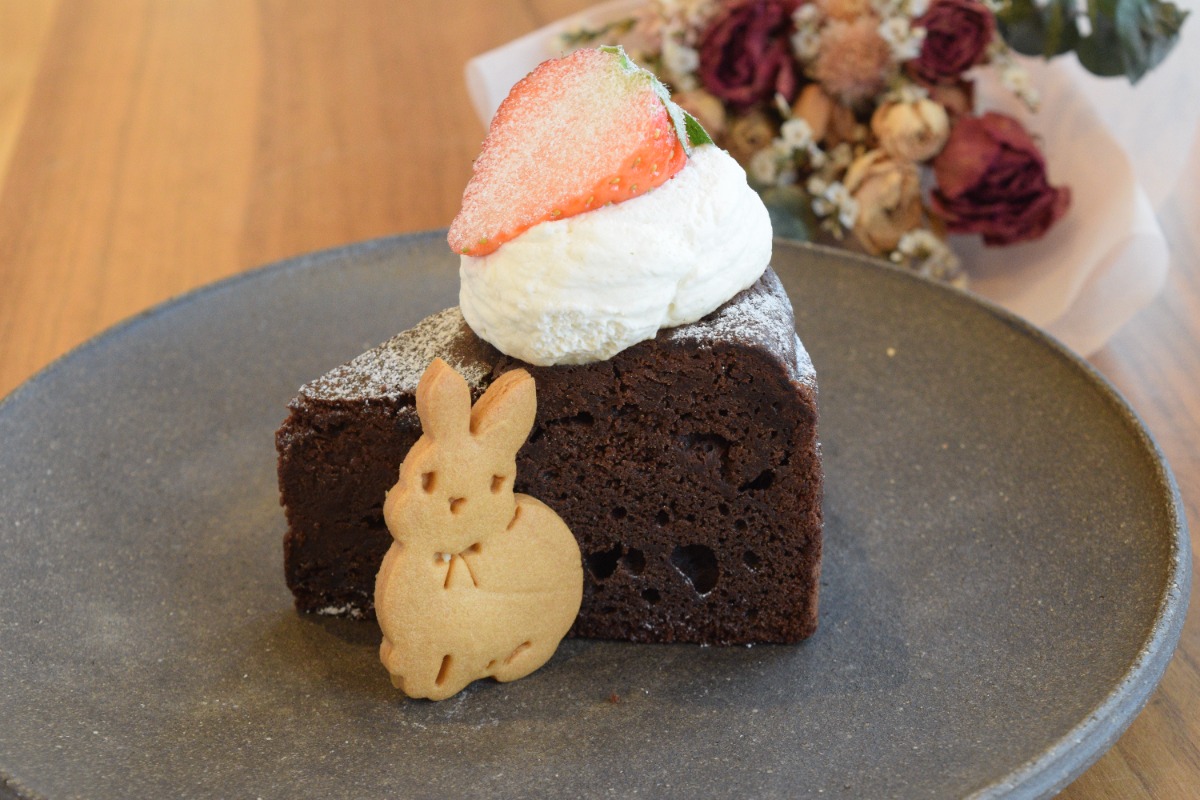 大和郡山市の、『イオンモール大和郡山店』からすぐ近くにある『farmer’s cafe Printemps(ファーマーズ カフェ プランタン)』。 冬から春は、自身の農園で育てたあすかルビーをふんだんに使ったケーキが登場する。 可愛らしいうさぎのクッキーに思わずメロメロ!