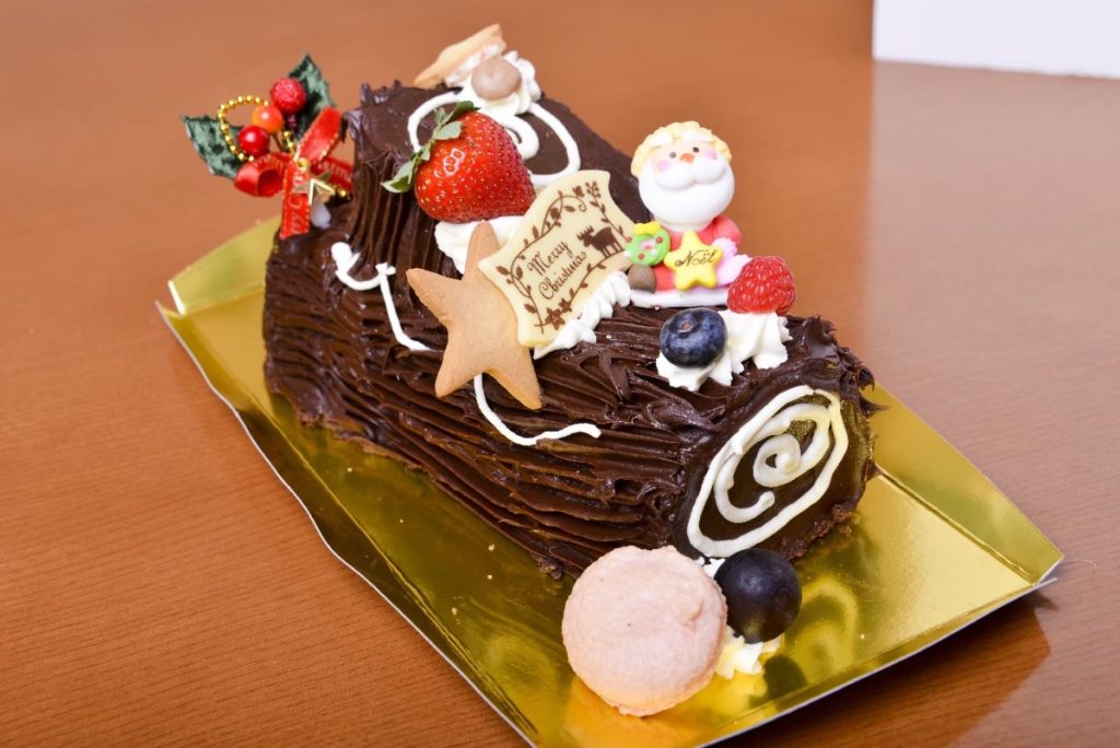 チョコのロールケーキに濃厚生チョコレートをコーティングし、切り株型に仕上げたクリスマス限定のケーキ。