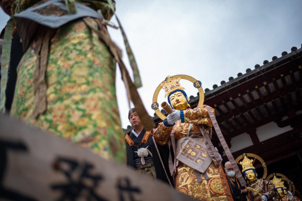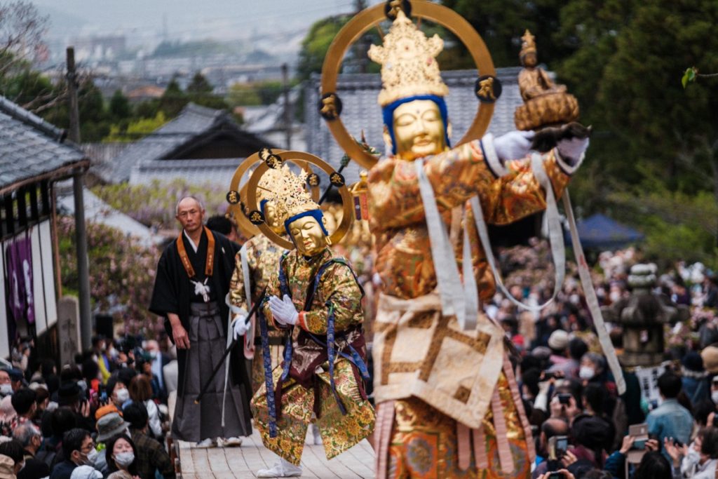 当日は、極楽に見立てた本堂と現世に見立てた娑婆堂の間、120メートルを橋で結び、きらびやかな普薩面と衣装を身にまとった菩薩の行列が練り歩く様子を見ることができる。