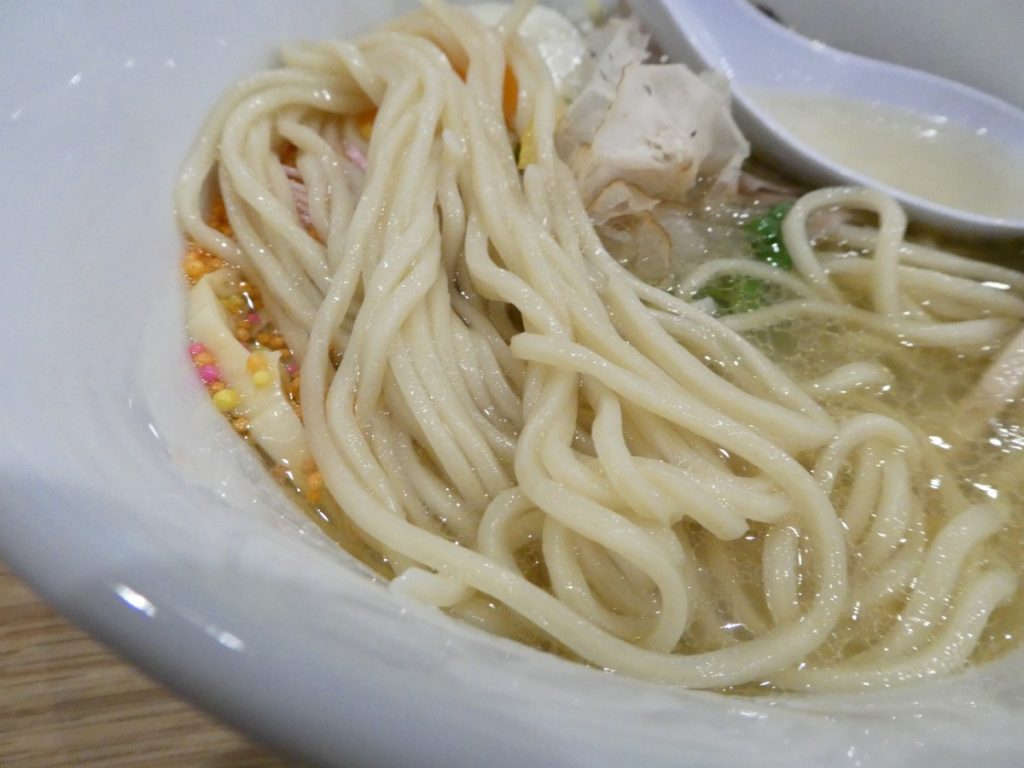 京都の老舗製麺所【麺屋棣鄂】から取り寄せる麺は、ラーメンやつけ麺によって太さや切り方を変えており、鶏節極塩らーめんは中細麺でツルムチッとした弾力が楽しめ、スープとの相性もばっちり!