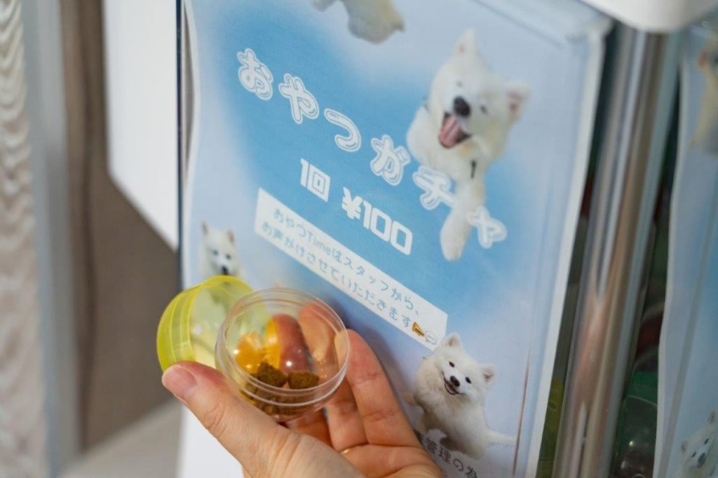 店内には、ガチャガチャが設置されており、カプセルの中にはサモエドたちのおやつが入っています。