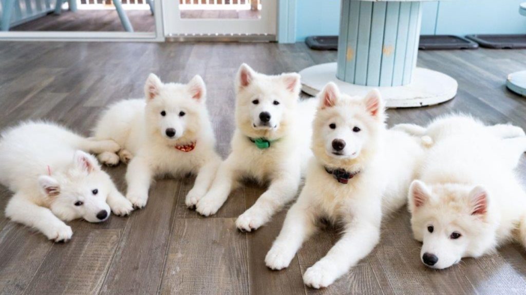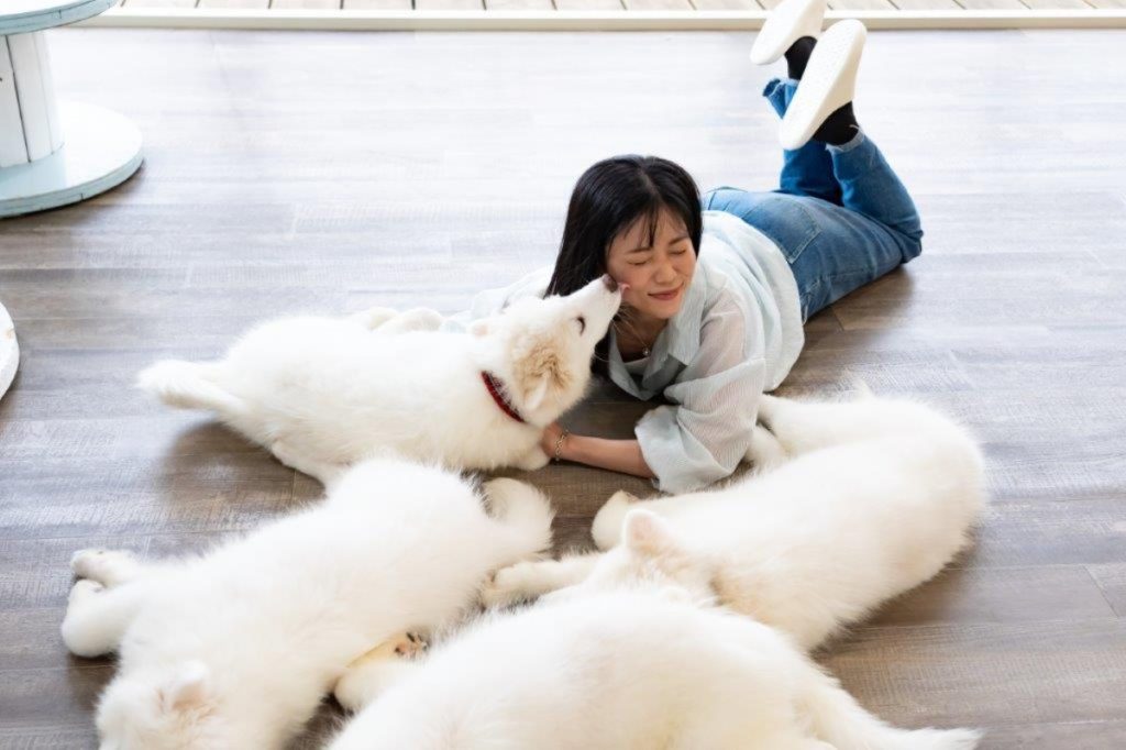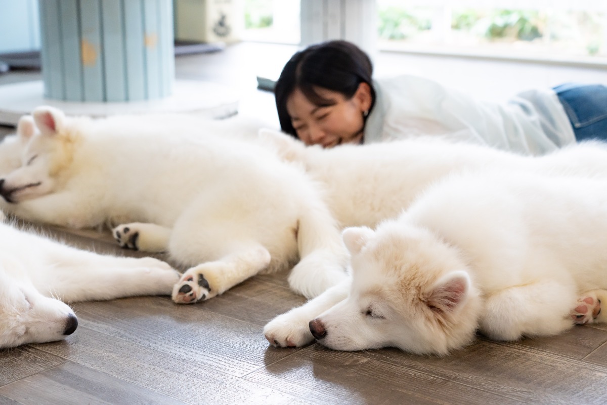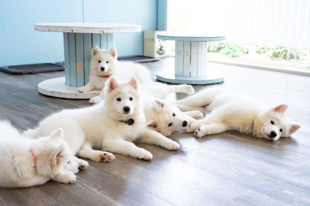 みなさんも、モフッとかわいすぎるサモエドに囲まれて癒やしのひとときを過ごしてみませんか?