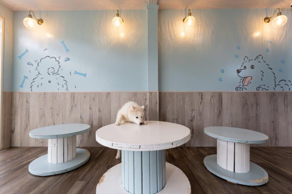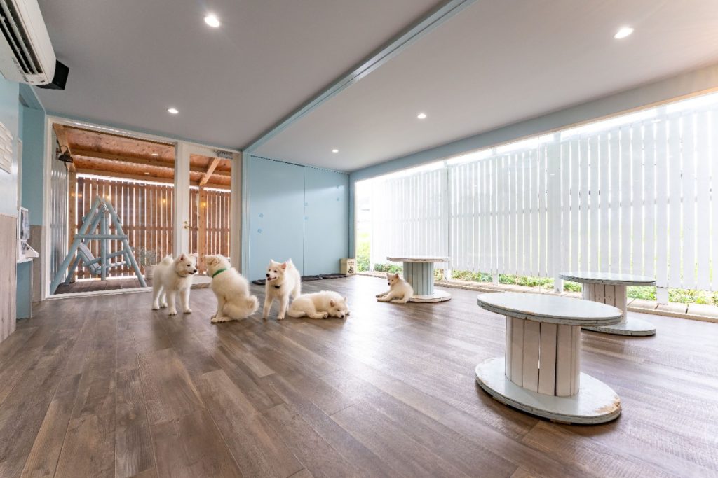 店内はナチュラルな空間で、サモエドがのびのびと走り回れる遊び場があり、お昼寝やリラックスもできる広々としたスペース。
