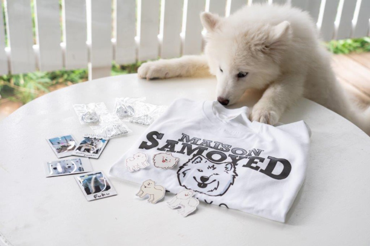 キーホルダーやTシャツなど、かわいいサモエドグッズも販売されています。