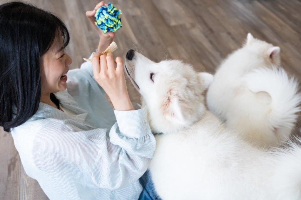 サモエドたちがおやつやおもちゃに喜ぶ様子や、いろんな反応を楽しめます。