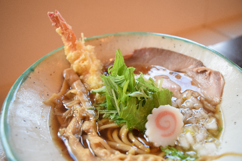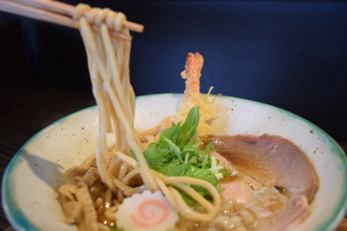 さらに天ぷらの油分が加わって、食べ進めるにつれて深みが増していきます。モチモチの自家製麺も食べ応え抜群。本店で人気の鶏天が味わえるのも嬉しいポイントです。