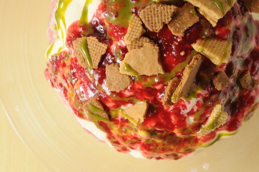 ラズベリのコンフィチュールをたっぷりかけて、パートシュクレと呼ばれるタルト生地、最後にピスタチオソースをかけて完成。