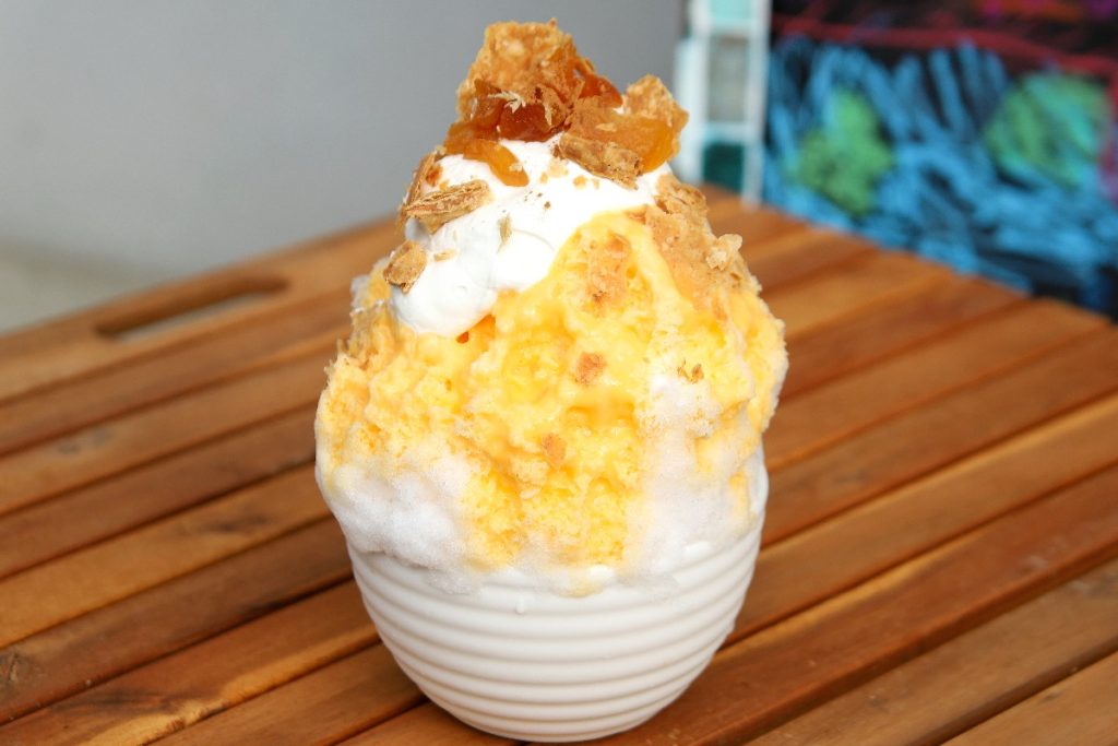 かき氷にカスタードクリームやカラメルをかけているのではなく、プリンそのものを凍らせて削っている。
