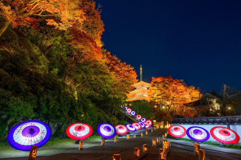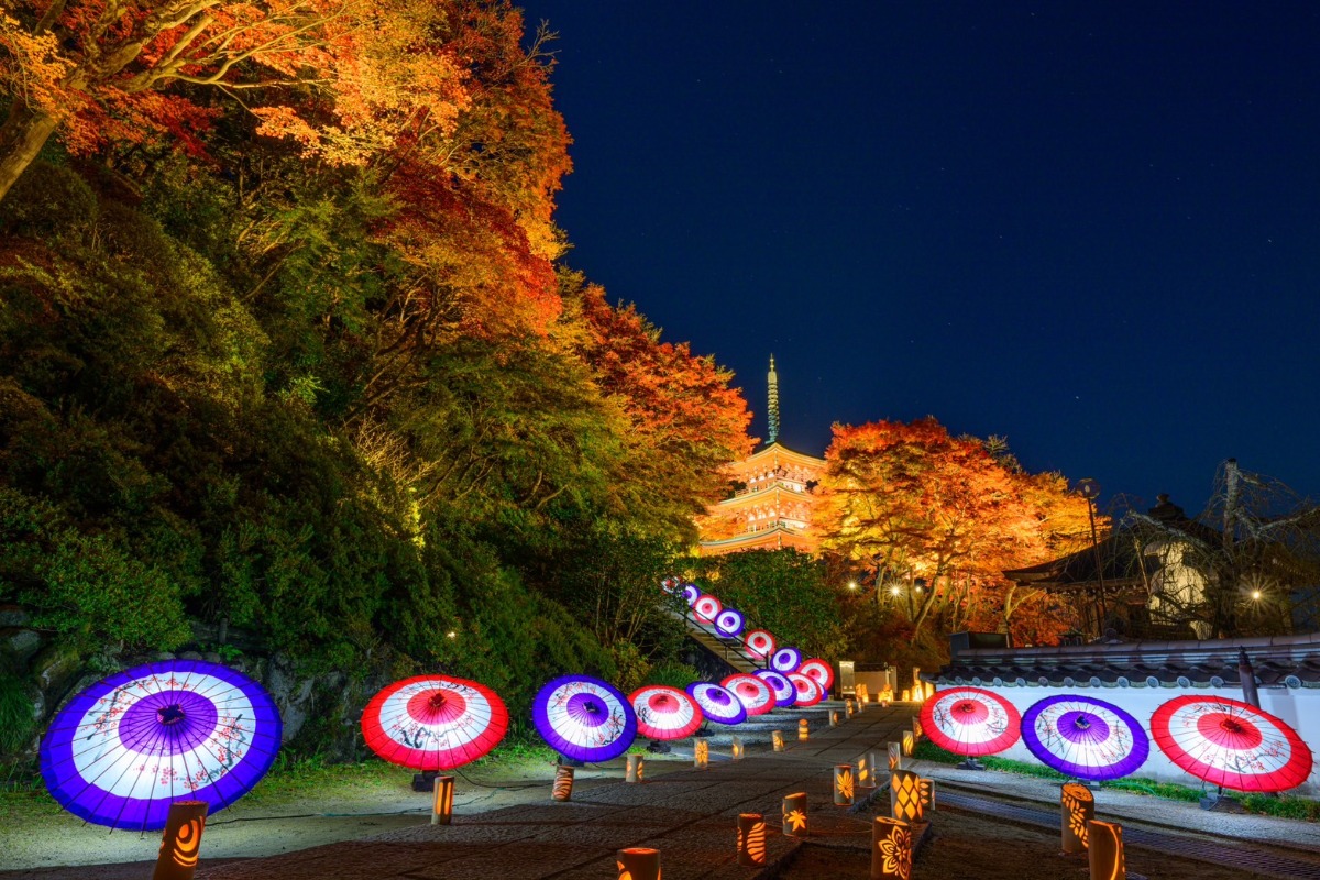 長谷寺、壷阪寺、岡寺と連携して2025年12月7日(日)まで「大和観音もみじ回廊」を開催中。ライトアップ夜間拝観も行われる。