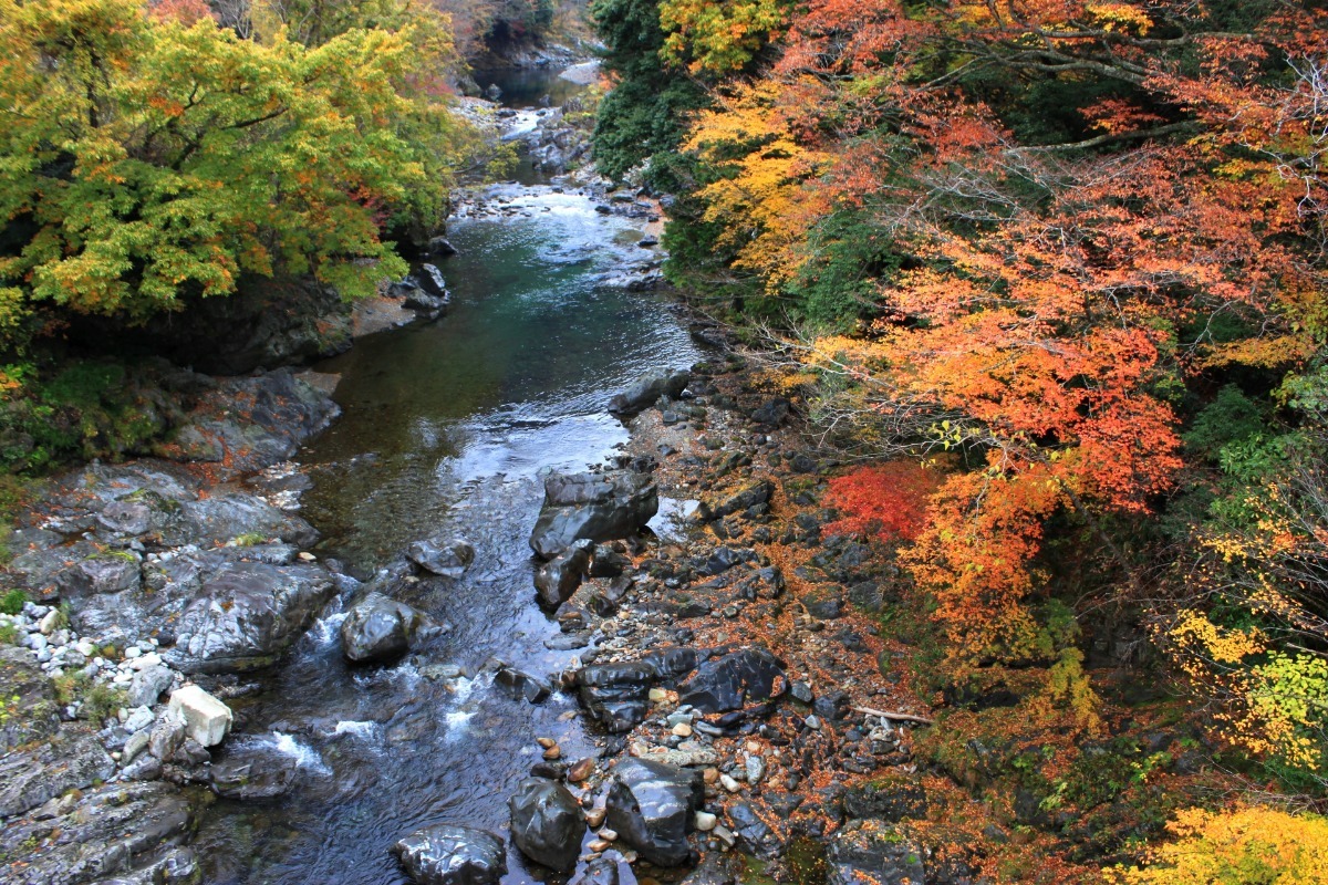 川沿いに整備された全長約7kmのハイキングコースでは、この時期ならではの色彩豊かな紅葉が楽しめる。