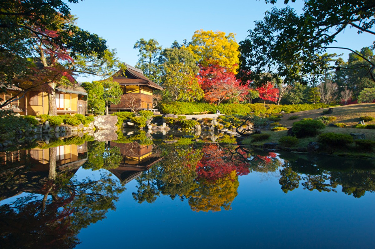 奈良を代表する池泉回遊式庭園で、江戸前期の「前園」、明治期の「後園」、二つの時代の様式で造られたどちらの庭園も紅葉の時期の美しさは格別。