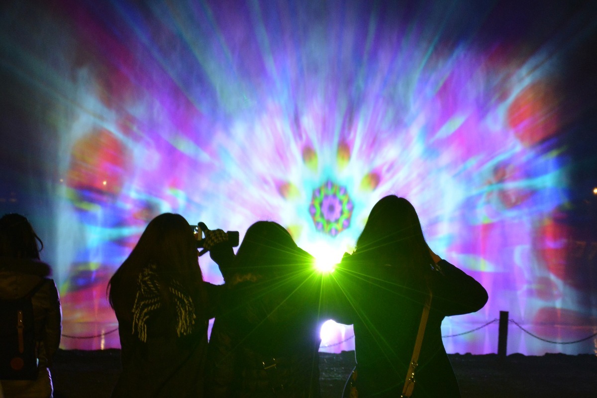期間限定の幅15m高さ5mの巨大なウォータースクリーンに、様々な映像を投影し演出するウォータープロジェクション。