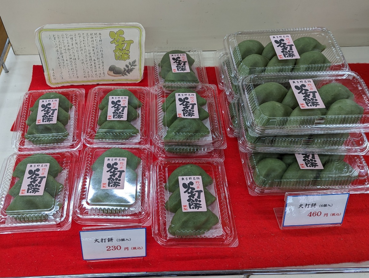 よもぎの生地で甘すぎないこし餡を包んだ火打石の形のお餅。