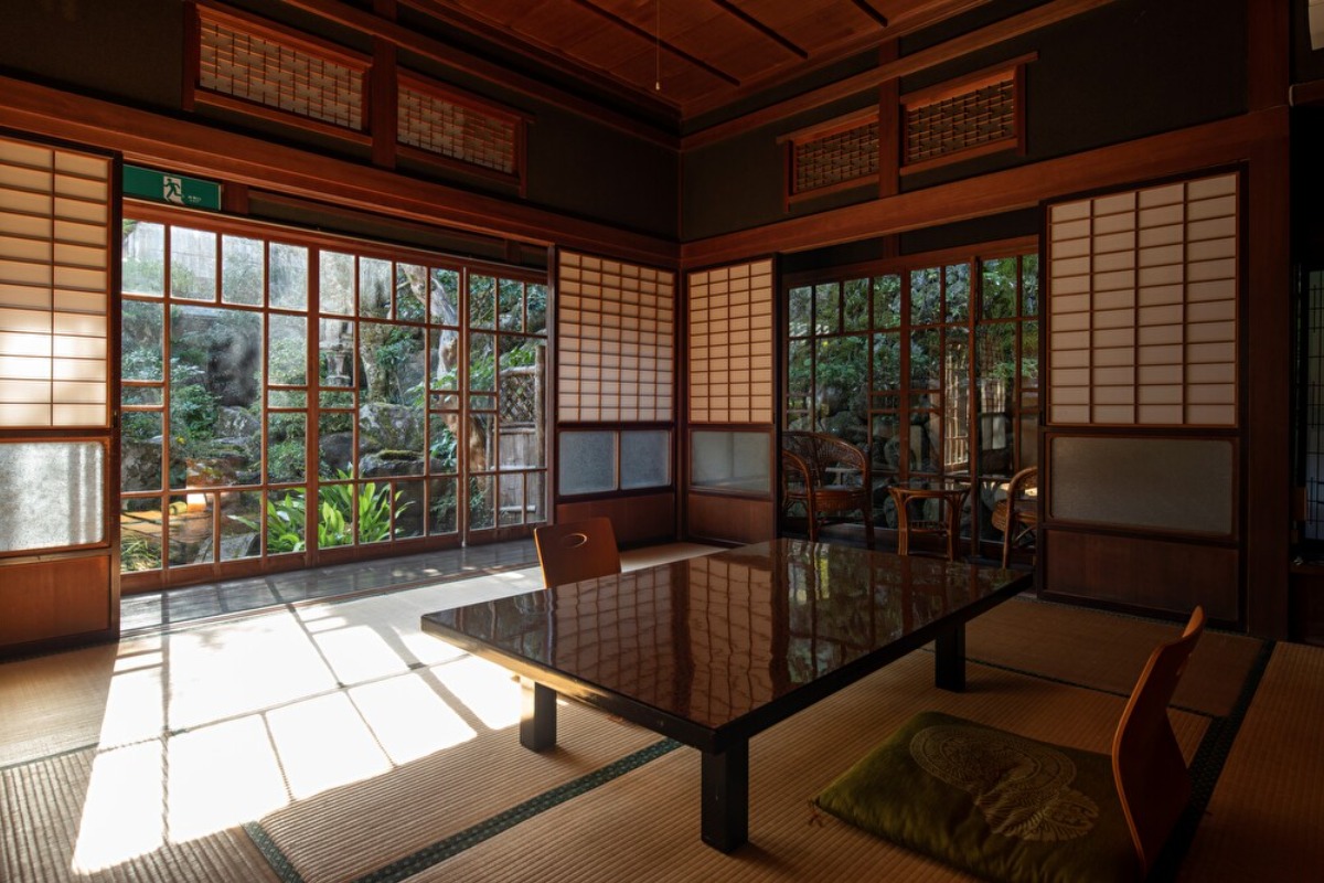 建築当時の趣を残す大正ガラス越しに眺める見事な庭園や、地元で採れる旬の食材を使った料理、山の水を炊いたお風呂など、この地ならではの情緒をたっぷりと堪能できる宿だ。