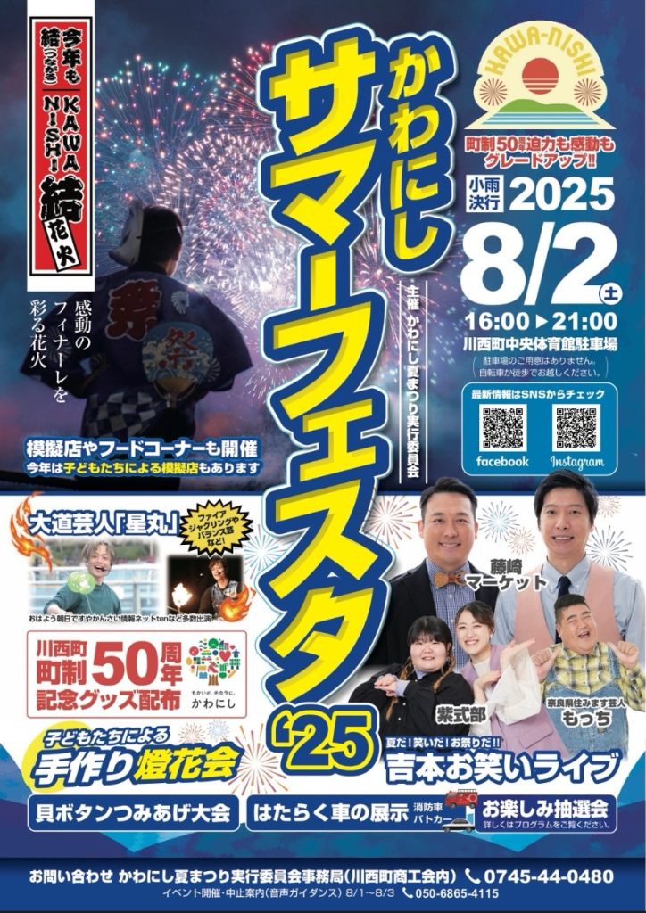 川西町制50周年で夏の風物詩もグレードアップ!吉本お笑いライブや花火で盛り上がろう!【かわにしサマーフェスタ2025】