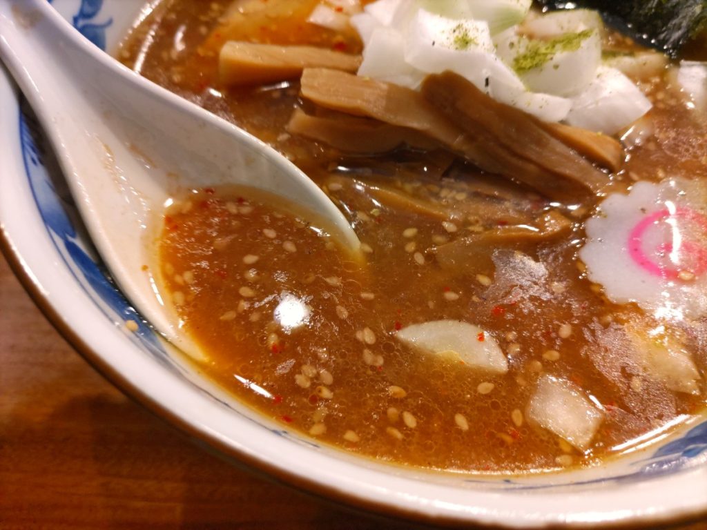 味噌にトッピングされた玉葱は、このタイミングでは新玉を使用されており、甘味が強くて口の中をリセットしてくれ、またスープを啜りたくなります。