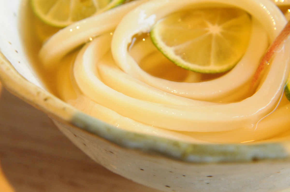 コシが強いもちもちの麺に、冷たいダシをたっぷり。その上に、スライスしたすだち丸々2個を乗せるとできあがり。