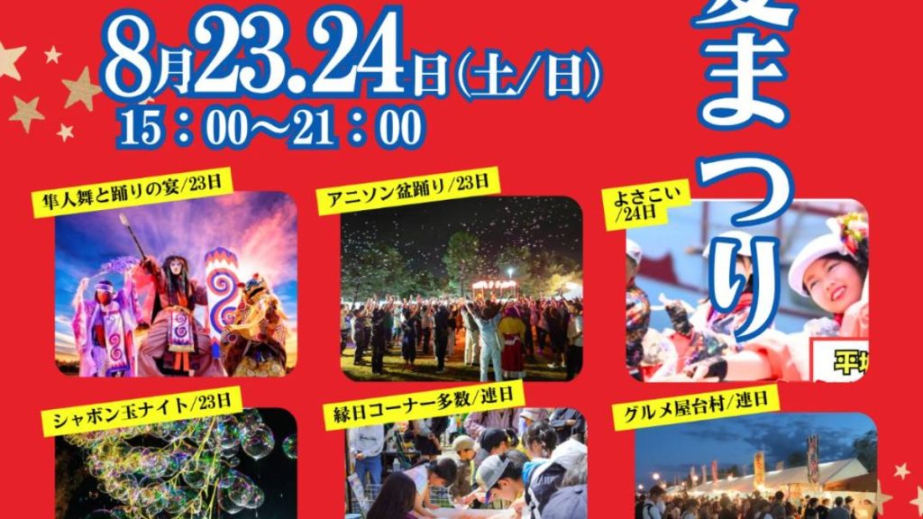夏祭りに欠かせない縁日やグルメ屋台はもちろん、人舞と踊りの宴、アニソン盆踊り、よさこい、シャボン玉ナイト、豪華景品の大ビンゴ大会と、お楽しみが盛りだくさん!