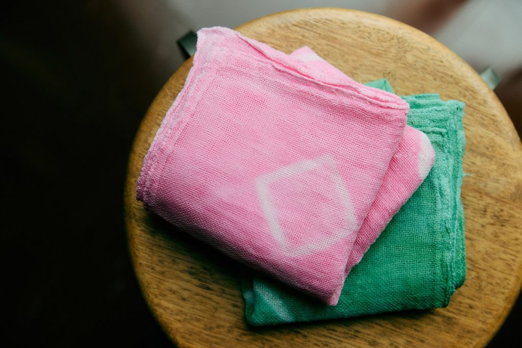 奈良の工芸・かや織ふきんに絞り染めをして、オリジナルの1枚を。