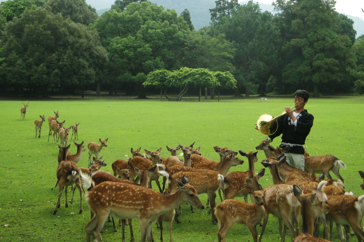 ホルンの音色に誘われ、大勢の鹿が森から駆け寄ってくる催し「鹿寄せ」。