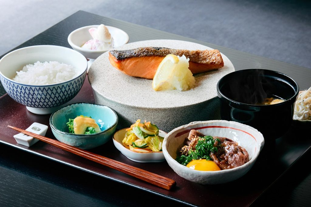 炊き立てのご飯と皮をパリッと焼き上げた銀鮭、ひとくちすき焼きをメインにこだわりの小鉢など、全8皿の至高の定食。
