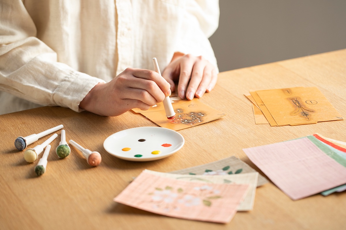 手績み手織り麻のはがきに、染め型をつかって図 柄をステンシルするワークショップ。