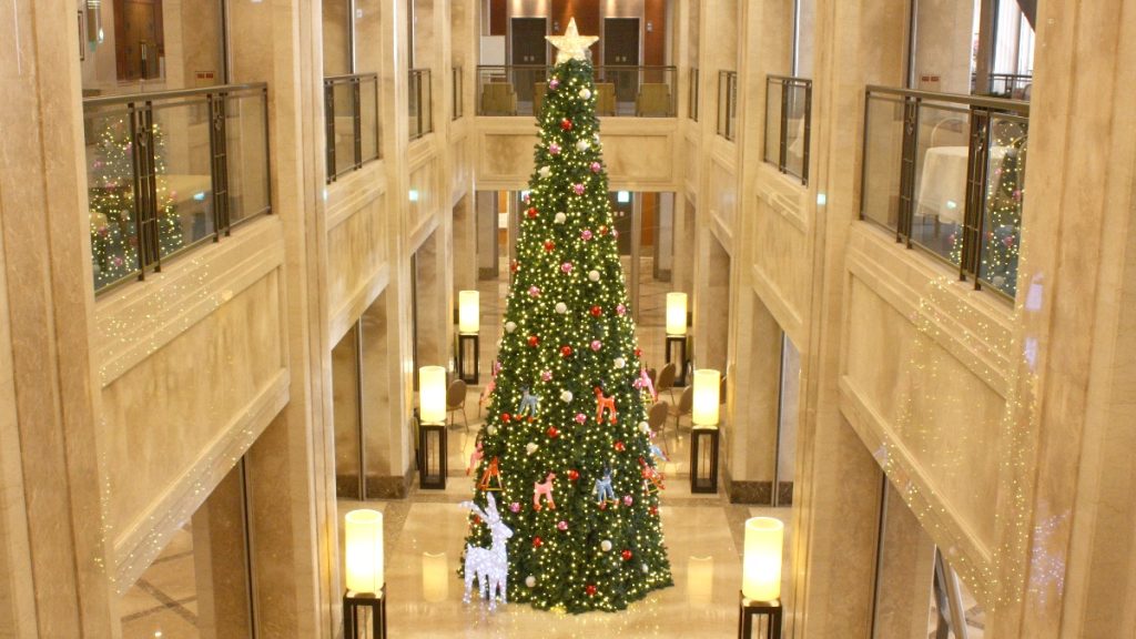 JR奈良駅直結の『ホテル日航奈良』では、2022年12月25日(日)まで、3階ロビー中央にいちごパフェカラーのクリスマスツリーが登場!