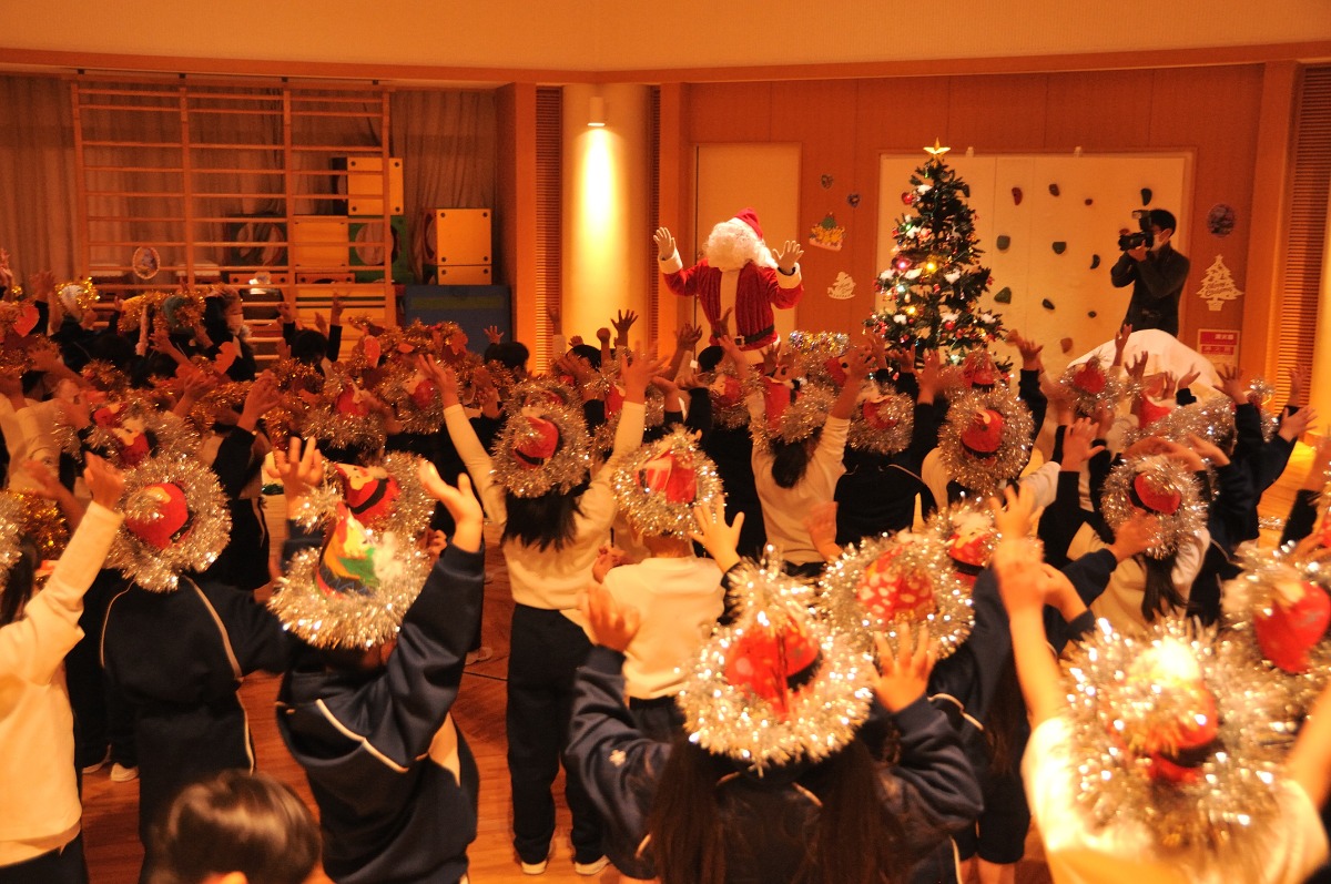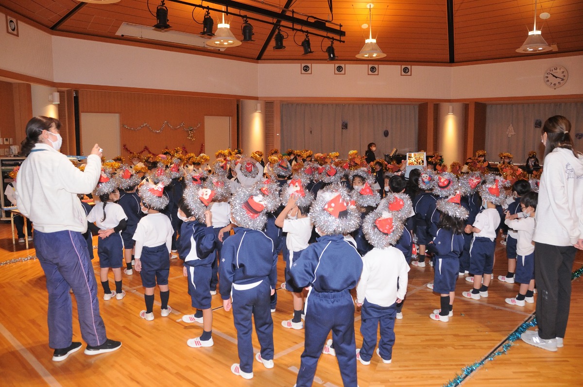 自分で作ったクリスマスの帽子をかぶって、ワクワクしながら体育室に集合。