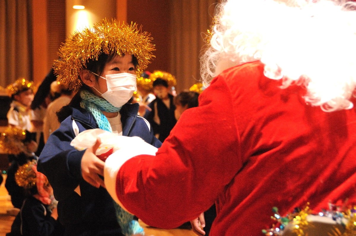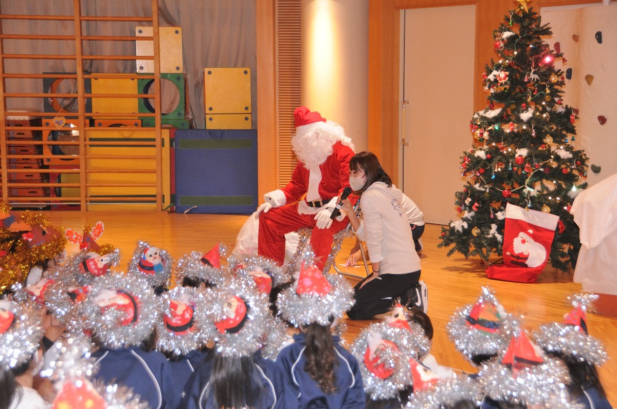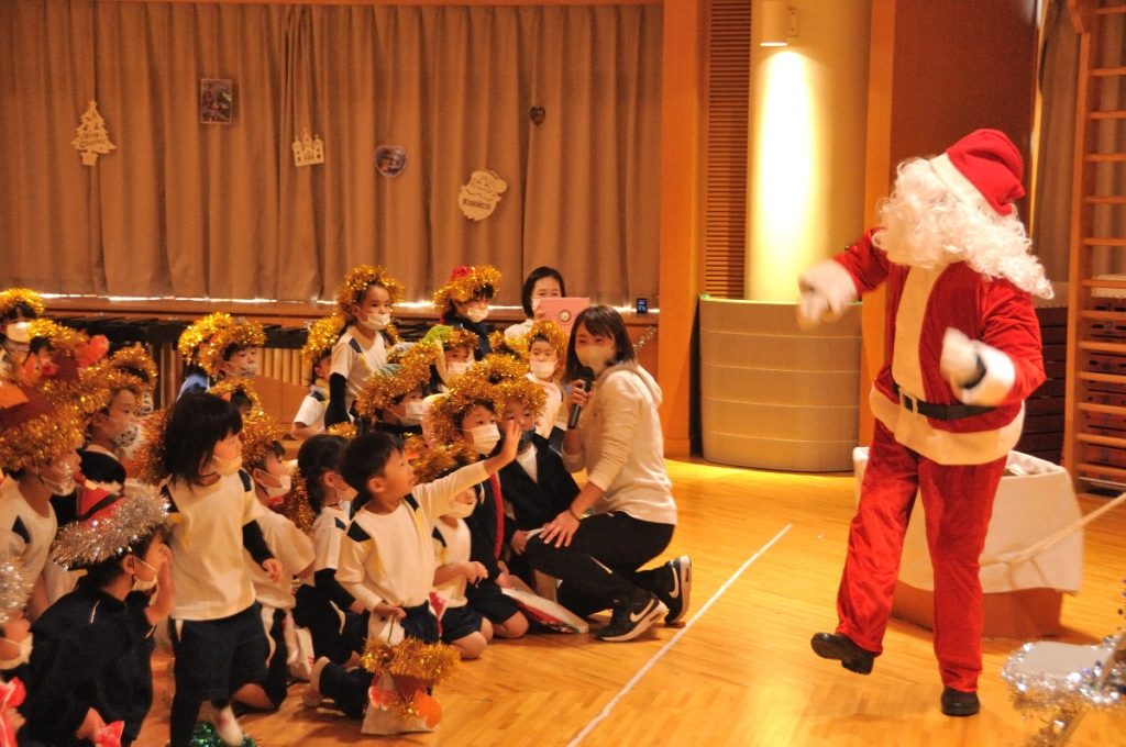子どもたちは突然のことに驚きながらも、笑顔でサンタクロースとふれあいます。