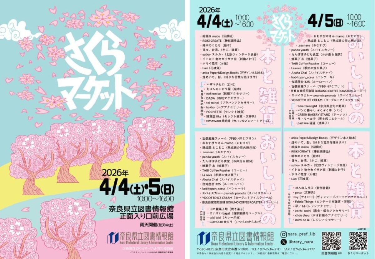 奈良の春の風物詩、佐保川の桜並木。その美しいロケーションを活かした素敵なイベント「さくらマーケット」が、県立図書情報館で開催される。